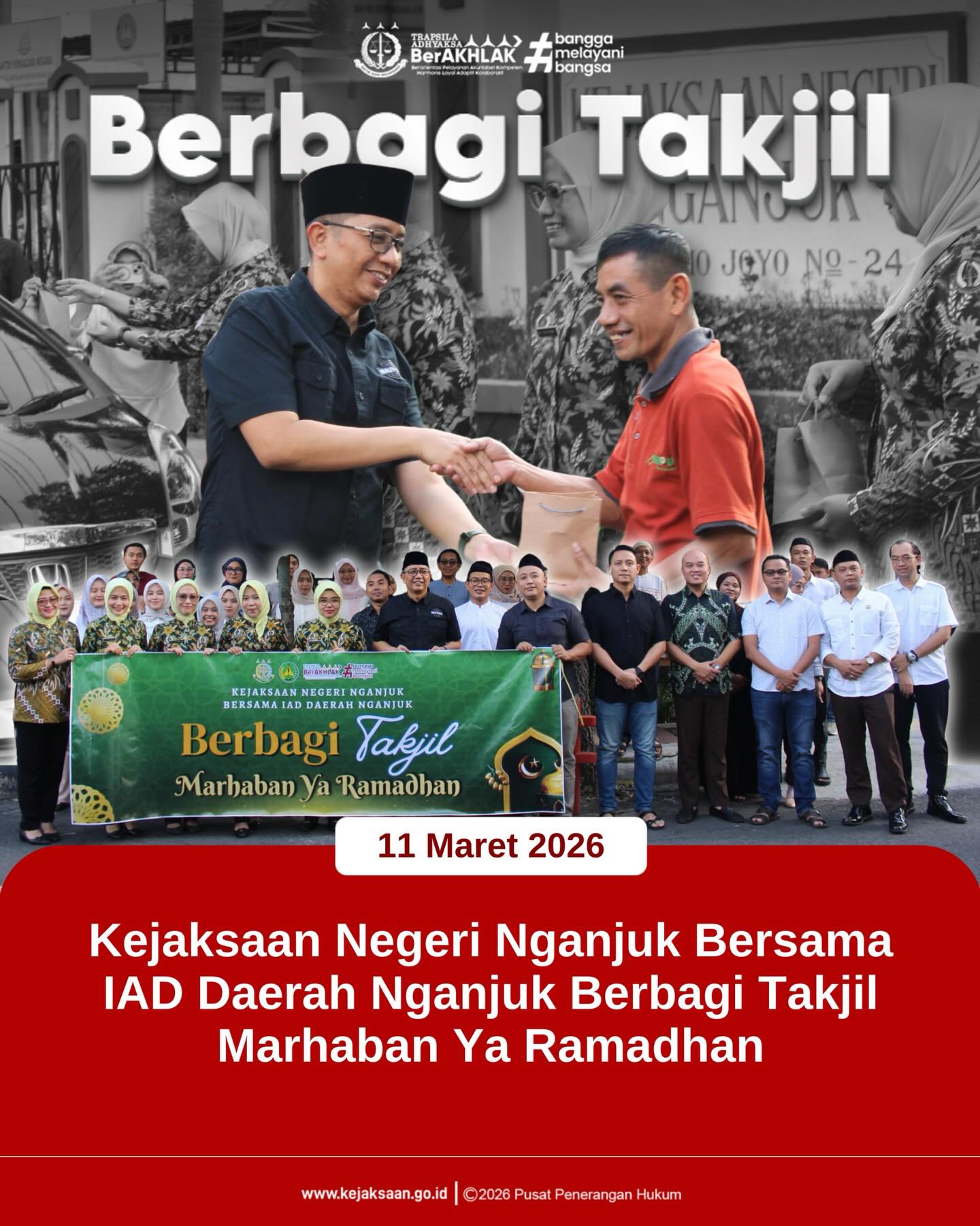 Kejaksaan Negeri Nganjuk bersama Ikatan Adhyaksa Dharmakarini (IAD) Daerah Nganjuk melaksanakan kegiatan berbagi takjil dalam rangka menyambut bulan suci Ramadhan 1447 H. Kegiatan ini dilaksanakan dengan membagikan paket takjil kepada para pengguna jalan dan masyarakat sekitar sebagai bentuk kepedulian sosial serta upaya mempererat hubungan antara Kejaksaan dengan masyarakat di Kabupaten Nganjuk.
