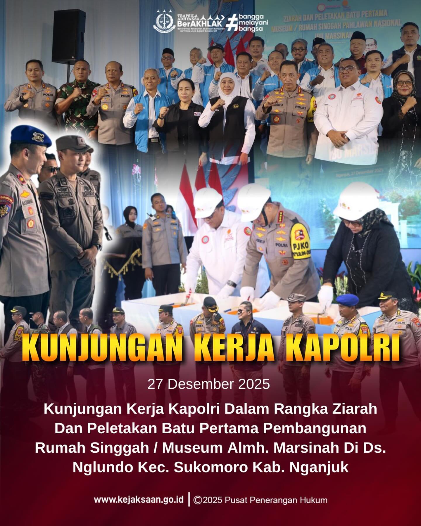 Kepala Kejaksaakaan Negeri Nganjuk Dr. Ika Mauluddhina, S.H., M.H., CSSL., CCD. diwakili oleh Kasi Pidum Bagus Priyo Ayudo, S.H., M.H. turut hadir dalam kunjungan kerja Kepala Kepolisian Negara Republik Indonesia ke Desa Nglundo, Kecamatan Sukomoro, Kabupaten Nganjuk dalam rangka ziarah serta peletakan batu pertama pembangunan Rumah Singgah/Museum Almarhumah Marsinah. Kegiatan ini merupakan bentuk penghormatan atas jasa dan perjuangan Marsinah sebagai simbol keberanian dalam memperjuangkan keadilan dan hak-hak pekerja, sekaligus momentum refleksi terhadap nilai-nilai kemanusiaan dan penegakan hukum di Indonesia.
