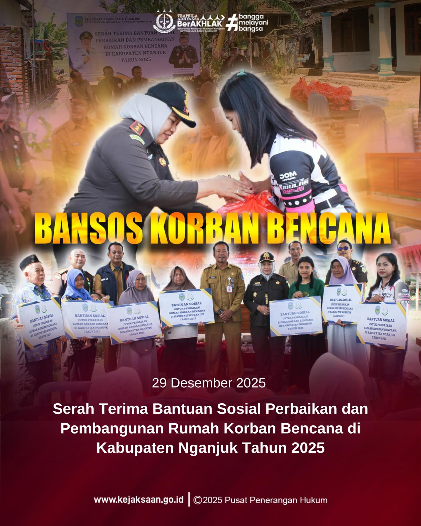 Kepala Kejaksaan Negeri Nganjuk Dr. Ika Mauluddhina, S.H., M.H., CSSL., CCD. bersama Dinas Perumahan dan Kawasan Permukimanmelaksanakan Penyerahan Bantuan Sosial Perbaikan dan Pembangunan Rumah bagi Korban Bencana di Kabupaten Nganjuk Tahun 2025. Kegiatan ini merupakan bentuk kehadiran pemerintah dalam membantu masyarakat yang terdampak bencana agar dapat kembali memiliki hunian yang layak, aman, dan nyaman. Program ini diharapkan mampu mempercepat proses pemulihan serta memberikan rasa aman bagi keluarga penerima manfaat dalam menjalani kehidupan sehari-hari.