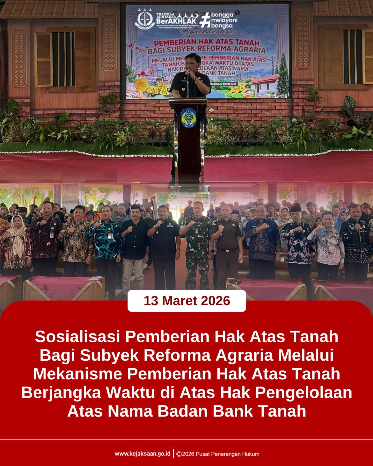 Kepala Kejaksaan Negeri Nganjuk Dr. Dino Kriesmiardi, S.H., M.H. yang diwakili oleh Kasi Datun Muhammad Junaidi, S.H., M.H. menghadiri kegiatan Sosialisasi Pemberian Hak Atas Tanah Bagi Subyek Reforma Agraria Melalui Mekanisme Pemberian Hak Atas Tanah Berjangka Waktu di Atas Hak Pengelolaan Atas Nama Badan Bank Tanah. Kegiatan ini dilaksanakan sebagai upaya memberikan pemahaman kepada masyarakat mengenai mekanisme pemberian hak atas tanah kepada subyek reforma agraria, khususnya melalui skema hak atas tanah berjangka waktu di atas Hak Pengelolaan yang dimiliki oleh Badan Bank Tanah. Melalui sosialisasi ini diharapkan masyarakat memperoleh informasi yang jelas mengenai prosedur, persyaratan, serta ketentuan hukum yang berlaku dalam pemanfaatan tanah yang dikelola oleh Badan Bank Tanah.